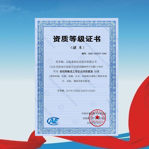 公司獲得中國音像協會音視頻工程專業委員會頒發(fā)的《音視頻集成工程企業資質貳級》證書,成為省內首批通過該權威機構認證的二級資質企業。